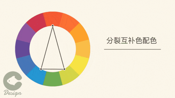 選定某種顏色之后,在選擇色環上與它補色相鄰位置上的兩種顏色進行搭配。此種搭配既有對比,又不失和諧。如果你對互補色搭配沒有自信的時候,可以用這種方案。